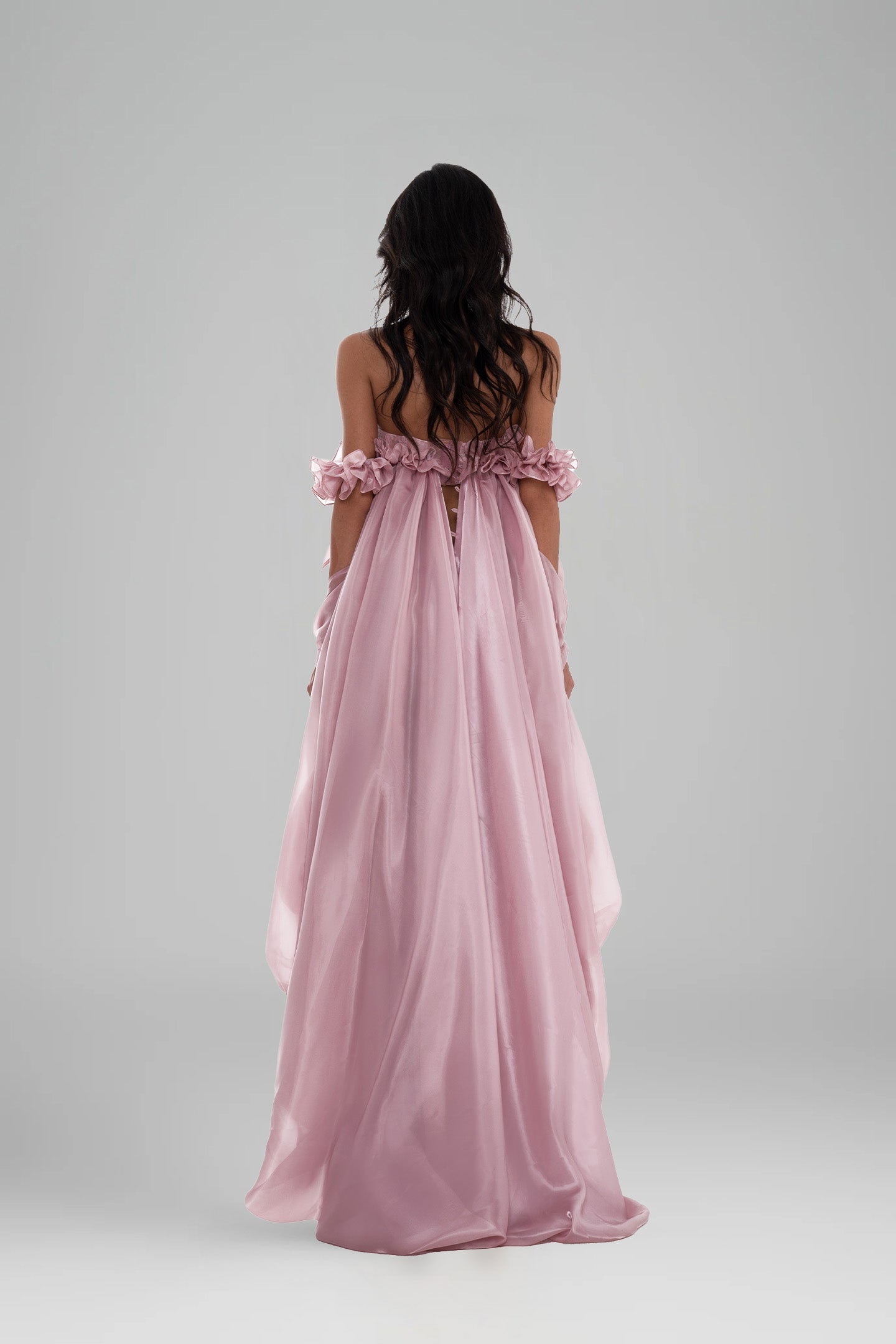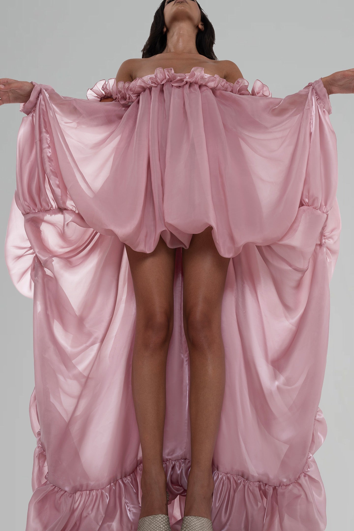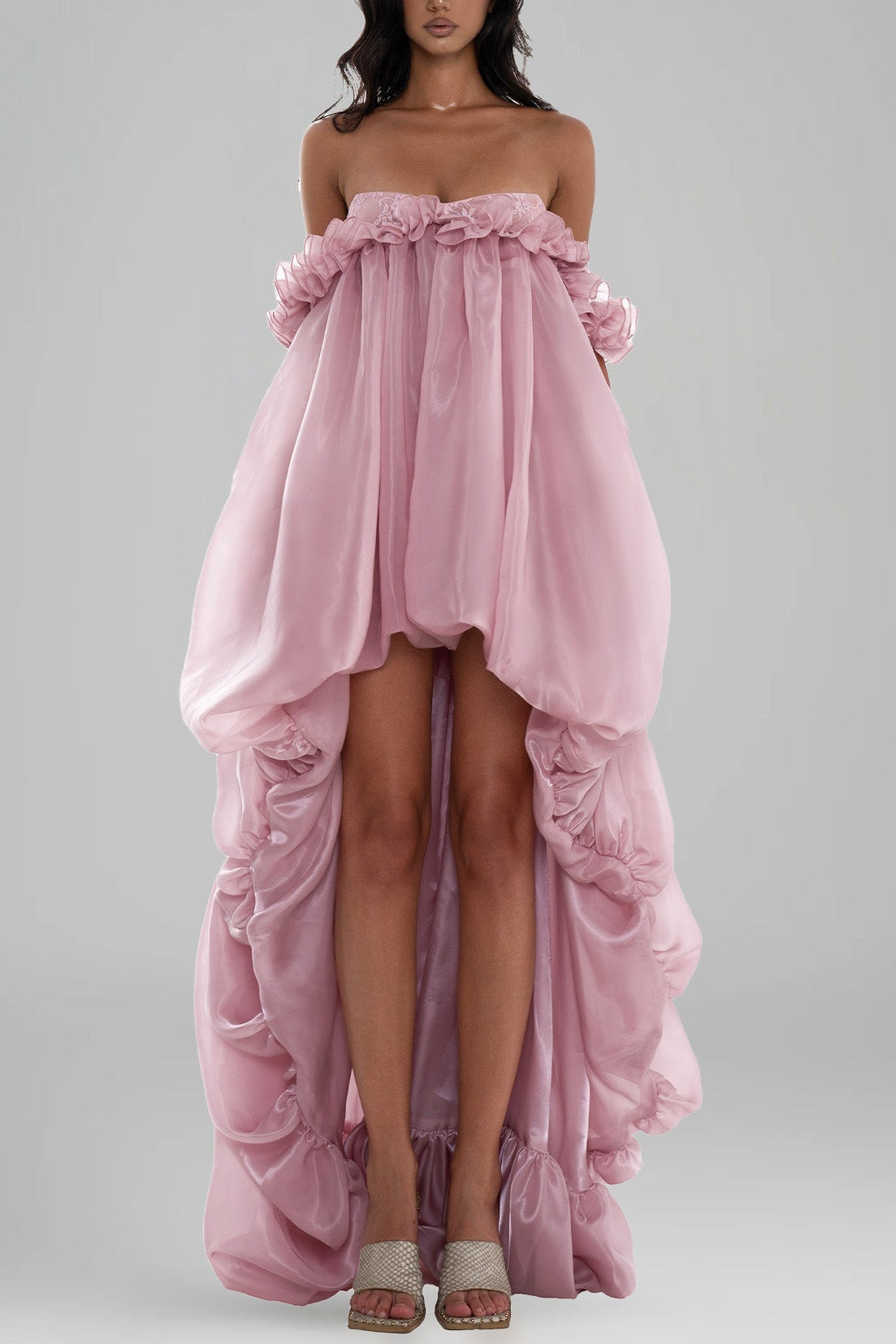 The Ily Dress captures whimsical charm and romantic fantasy with its airy chiffon and delicate lace. Structured yet soft, it features sculptural ruffle details and a fairytale-inspired high-low hem with a voluminous bubble effect, perfect for twirling with grace and elegance.