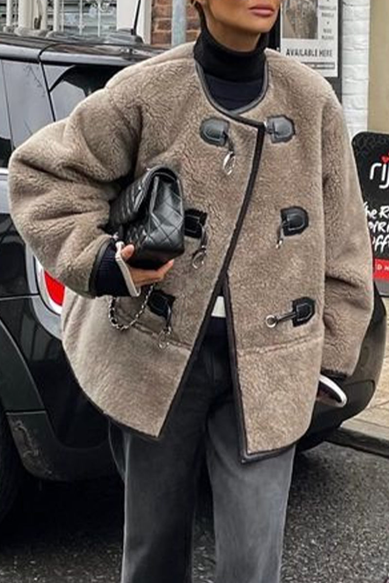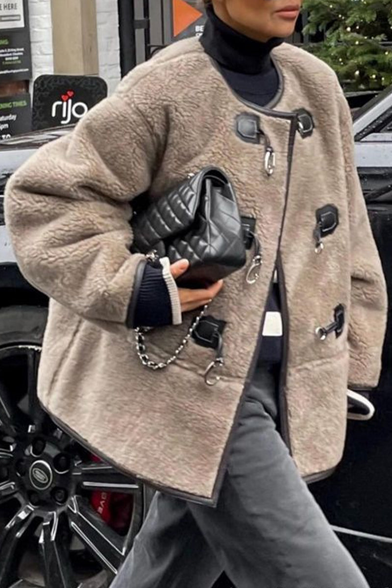 Details: Material: Polyester, Sheep plush Style: British Style, Elegant Pattern Type: Solid Element: Buttons Neckline: U Neck Sleeve Style: Regular Sleeve Sleeve Length: Long Sleeve Clothing Length: Regular Type: Solid Color Size(in) Bust Length Sleeve Length Shoulder Width S 47.2 24 20.1 23.6 M 48.8 24.4 20.5 24 L 50.4...