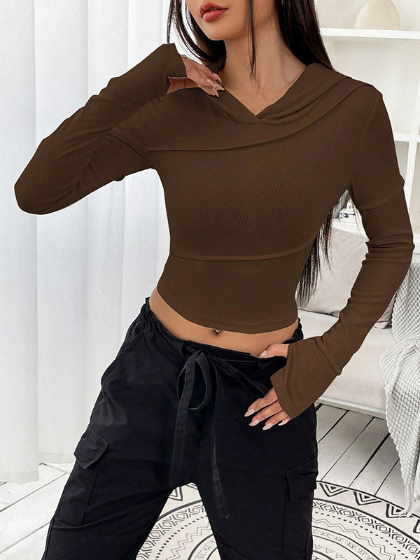 Hooded Long Sleeve Hollow Solid Color V-Neck T-Shirt