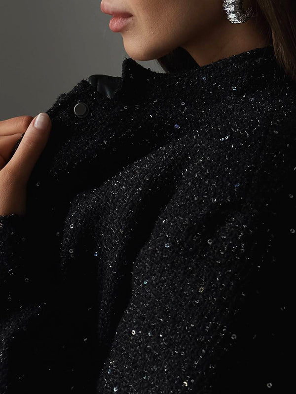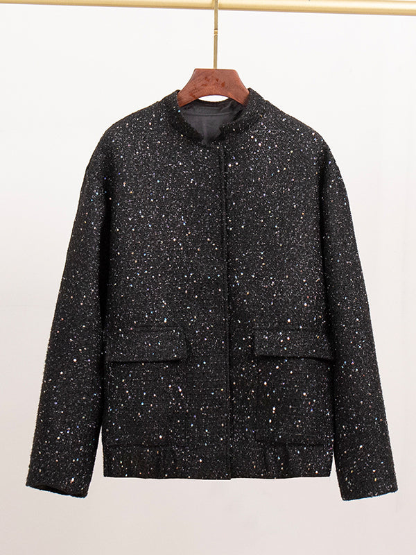 Design Features: This stylish jacket showcases a loose fit with long sleeves and a stand collar, adding a trendy touch. The buttoned front and strategically placed pockets enhance functionality, while the sequined accents provide a hint of sparkle and uniqueness.