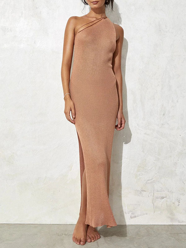 Asymetryczna, jednokolorowa, długa sukienka na jedno ramię