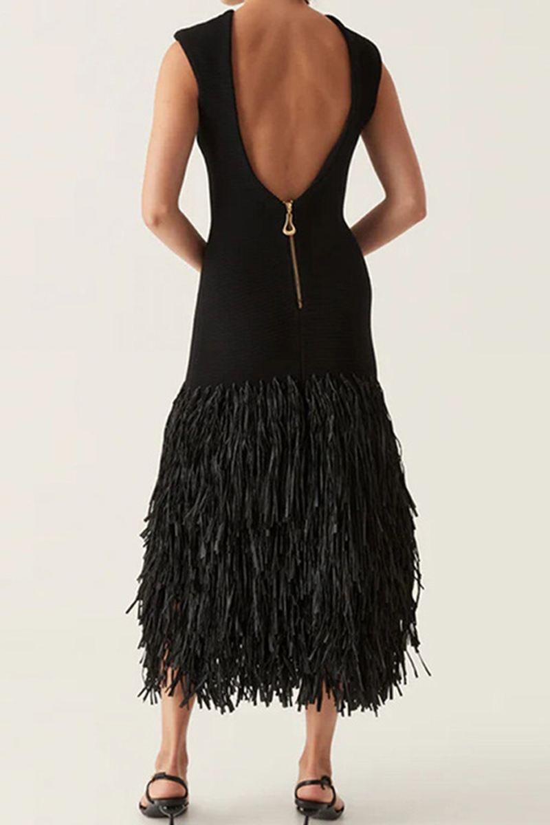 Sukienki na imprezę z frędzlami i okrągłym dekoltem, bez rękawów