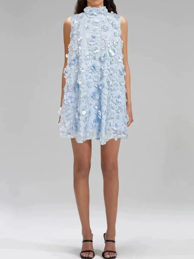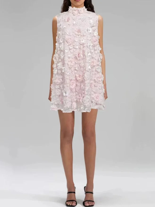 3D Floral High Neck Trapeze Mini DressMaterial: Polyester Delicate and captivating, the 3D Floral Appliqué High Neck Trapeze Mini Dress is a modern fairytale piece designed to enchant. Crafted in a soft, flowy trapeze silhouette, this sleeveless mini dress features intricate 3D floral appliqués and delicate beadwork, creating a textured, ethereal...