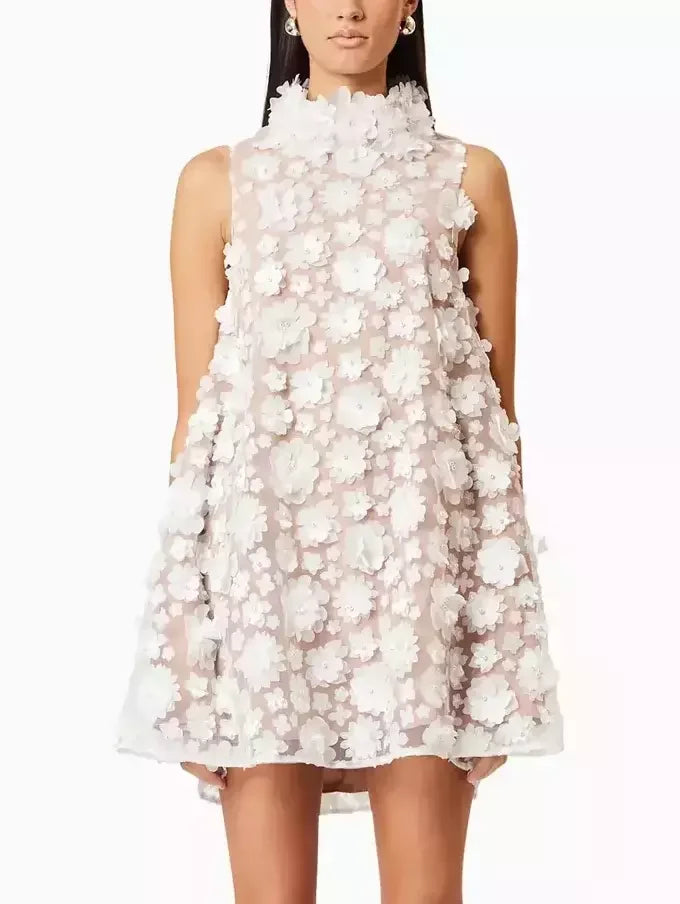 Delicate and captivating, the 3D Floral Appliqué High Neck Trapeze Mini Dress is a modern fairytale piece designed to enchant. Crafted in a soft, flowy trapeze silhouette, this sleeveless mini dress features intricate 3D floral appliqués and delicate beadwork, creating a textured, ethereal look. The dimensional floral details add depth and visual interest, making this high neck trapeze mini dress a truly unique statement piece.