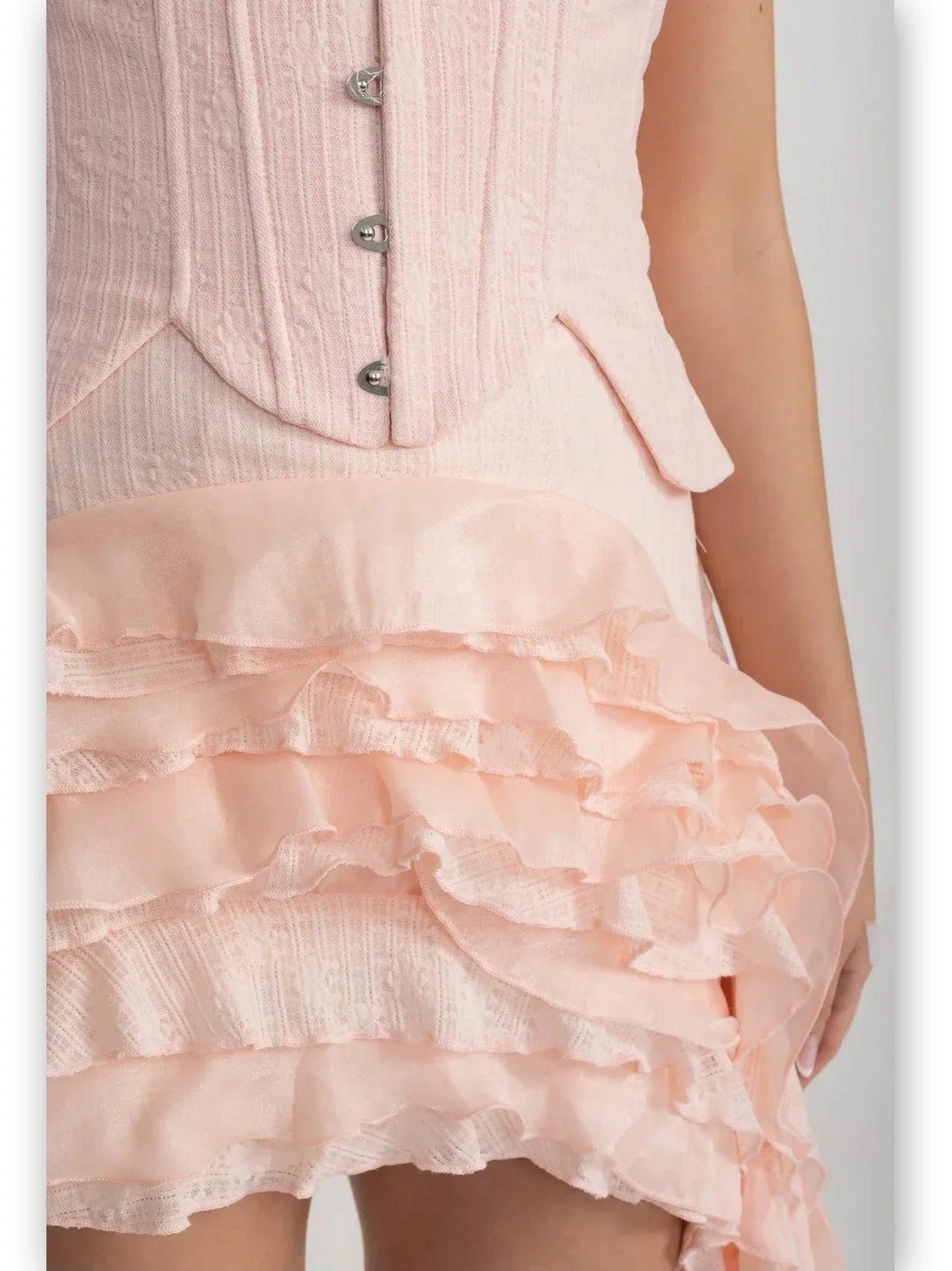 Asymmetrical Tiered Ruffled Corset Mini Dress in Soft Pink
